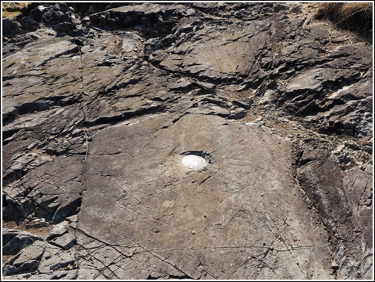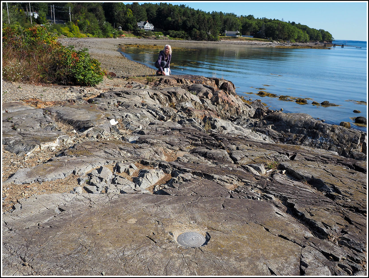 Our first mark of the day is a mere 13 meters from a USGS mark we found back in 2007. This one, a MaineDOT survey control disk, was set in 2011, so it wasn’t even here the last time we visited this ledge. I just love this area. Although it is literally a few feet away from the highway, something about it feels so peaceful and serene. I would love to sit here and read, or have a snack in the sunshine. Anyway, we found the mark easily, and then confirmed that K 10 (the USGS mark) is still in place (it is).