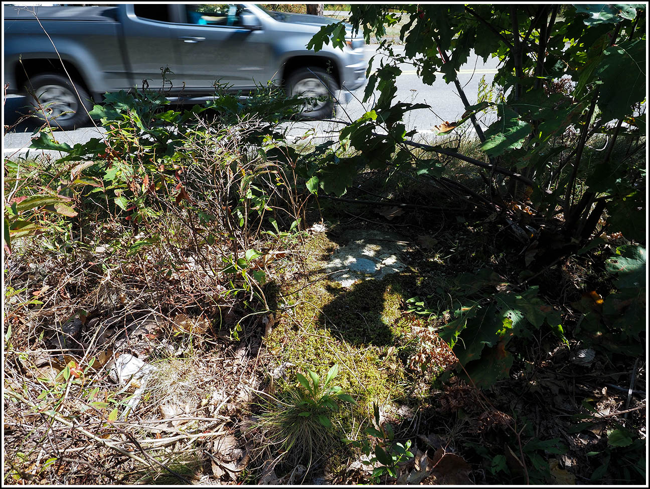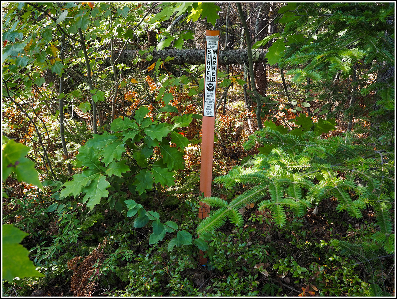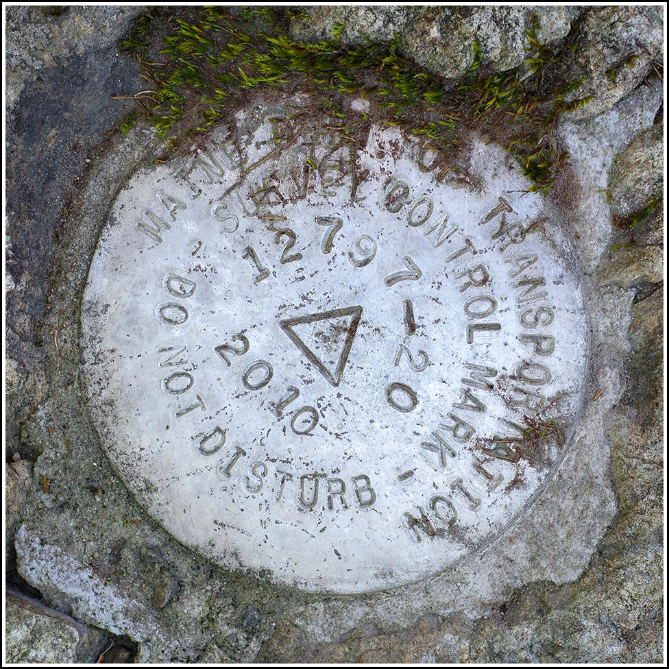 We were pretty sure that if we could access this area, we’d have a two-fer: not only this mark, but also the USGS mark K 3 very close by. As usual, we had scoped out the area on Street View and had a good idea where to search. We had even spotted on Street View, through the pixellated brush, a survey mark witness post, so we were even more sure we had the right spot. We parked in an empty lot very close to the coordinates and made our way through the prickly brush and conifers. Spotting the witness post easily, we began to look around for the marks. The first one we spotted, on a nicely exposed section of an outcrop, was this mark, the MaineDOT survey control mark. We cleaned it off and documented it with photos, and then moved on to search for K 3, just 36 feet away.