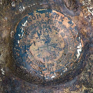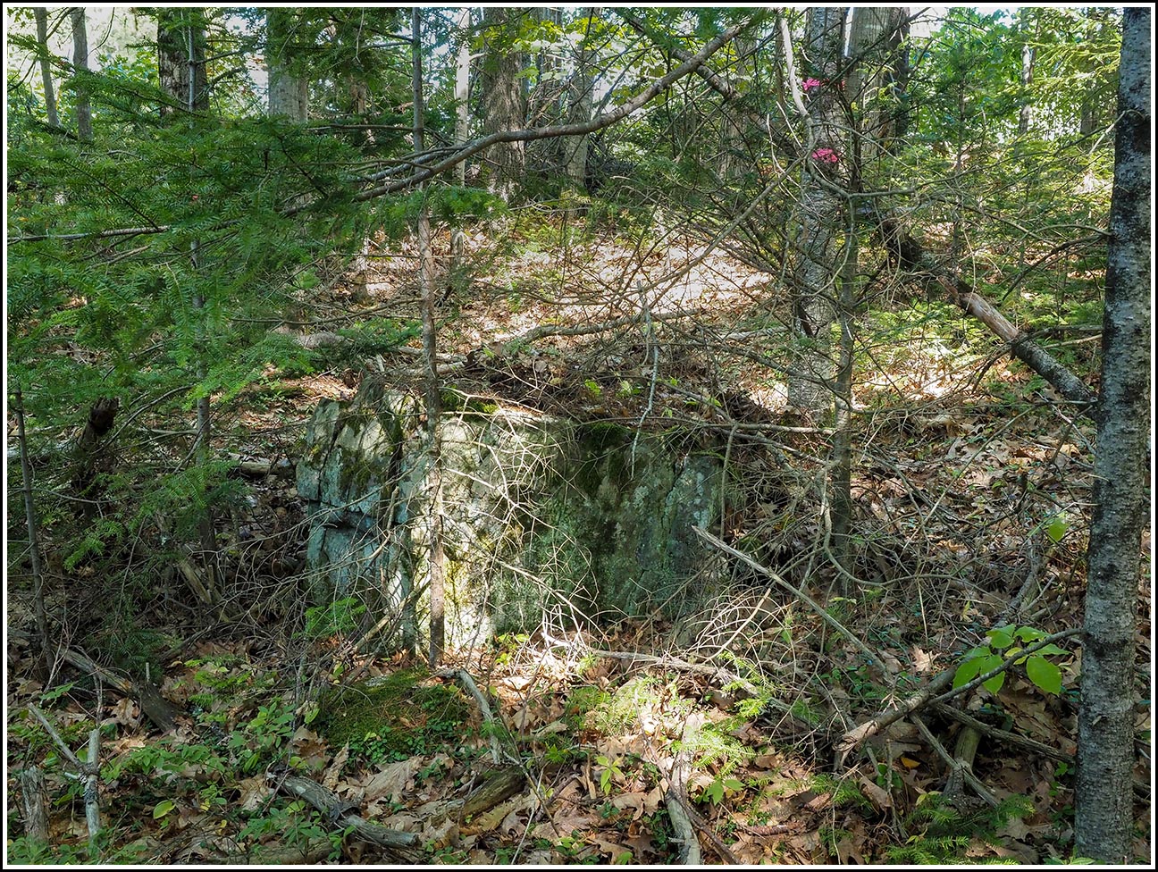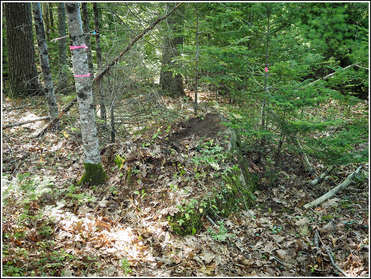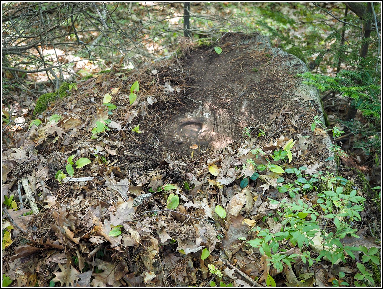 Thanks again to JRO, we were pretty confident that we could find this mark. He described a large boulder and even specified where on the boulder the mark was set, which helped a lot in knowing where to clear off the surprising amount of soil, roots, and leaves that had accumulated since his visit only two years ago. Because, and only because, of his precise description, I was able to find the mark pretty easily. The layer of soil and roots pulled off pretty easily, and we just had to pull and cut a few extra roots, and brush away some loose soil, to clean off the area quite well. There was some evidence of fluorescent orange paint around the mark, but nothing recent. The stamping is also pretty faint and tricky to read, but ultimately it is legible. Note that while we parked at the nearby automobile dealer, we initially entered from the highway side, but this was messy and difficult walking. It is much easier to enter from the north end of the dealer lot, where there is essentially a path that enters the woods, from which it is very easy to reach the mark (just a few meters’ walk through mostly open woods).