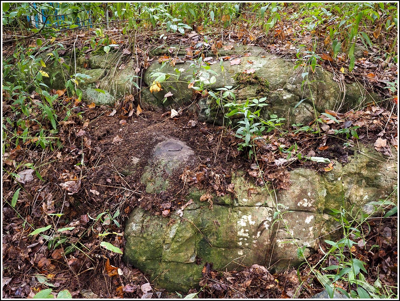 Well … the ledges all seemed to be covered over with a thick layer of soil and roots. How could it have changed so much in the three years since the mark was last recovered? I naively thought I would be led right to the mark by the witness sign that JRO had placed, as has happened with other nearby marks, but there was simply no evidence of it anywhere. Even if the sign was gone, I figured that the fencepost would still be around somewhere, but it wasn’t. It took some good use of the rangefinder combined with JRO’s reference points and some old-time benchmark hunting intuition to zero in on the correct ledge, but even then I was unsure. The first tentative swipes with my hand showed that there was at least 3-4 inches of soil and fine root buildup on the top surface of the ledge. Rich retrieved the trowel and brush from the car, and I began scraping the rock. I was just about to give up when I spotted the nice round edge of the mark! I could hardly believe it. It was so well hidden and also so well camouflaged, that even when I knew exactly where it was, when I took my photos from a distance, it was hard to spot.